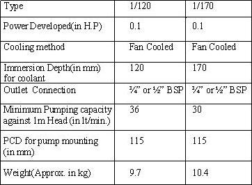We design coolant pumps at 0.1 hp as per the design specifications we receive from our clients. Our professionals thoroughly understand the requirements and thereafter implement into a wide range of high performance, world class coolant pumps. These pumps can be used on all machine tools performing Turning, Milling, Drilling, Cutting, Slitting, Grinding and other operations. Following are some of the technical specific features of our pumps: